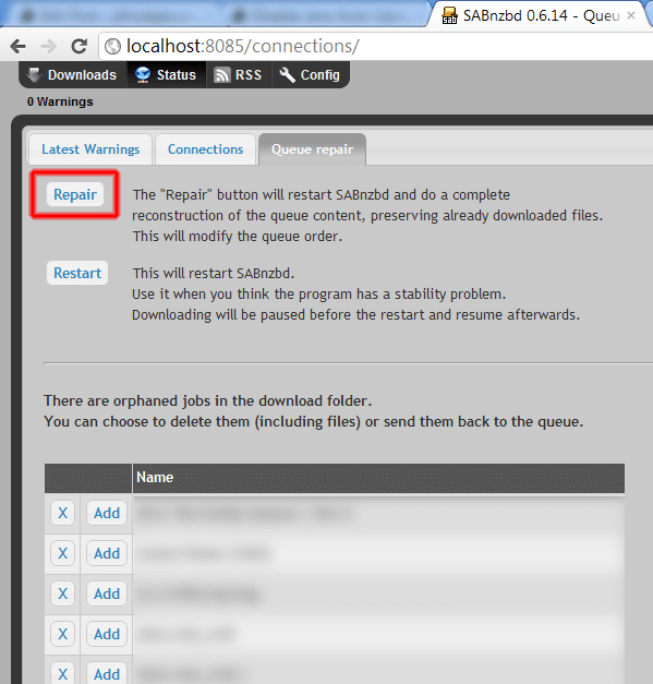 Screenshot showing the ‘Repair’ button in the sabnzbd interface