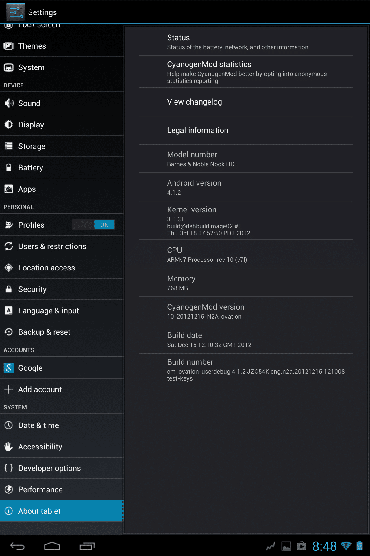 Nook HD+ Android Settings Screen -> About this tablet