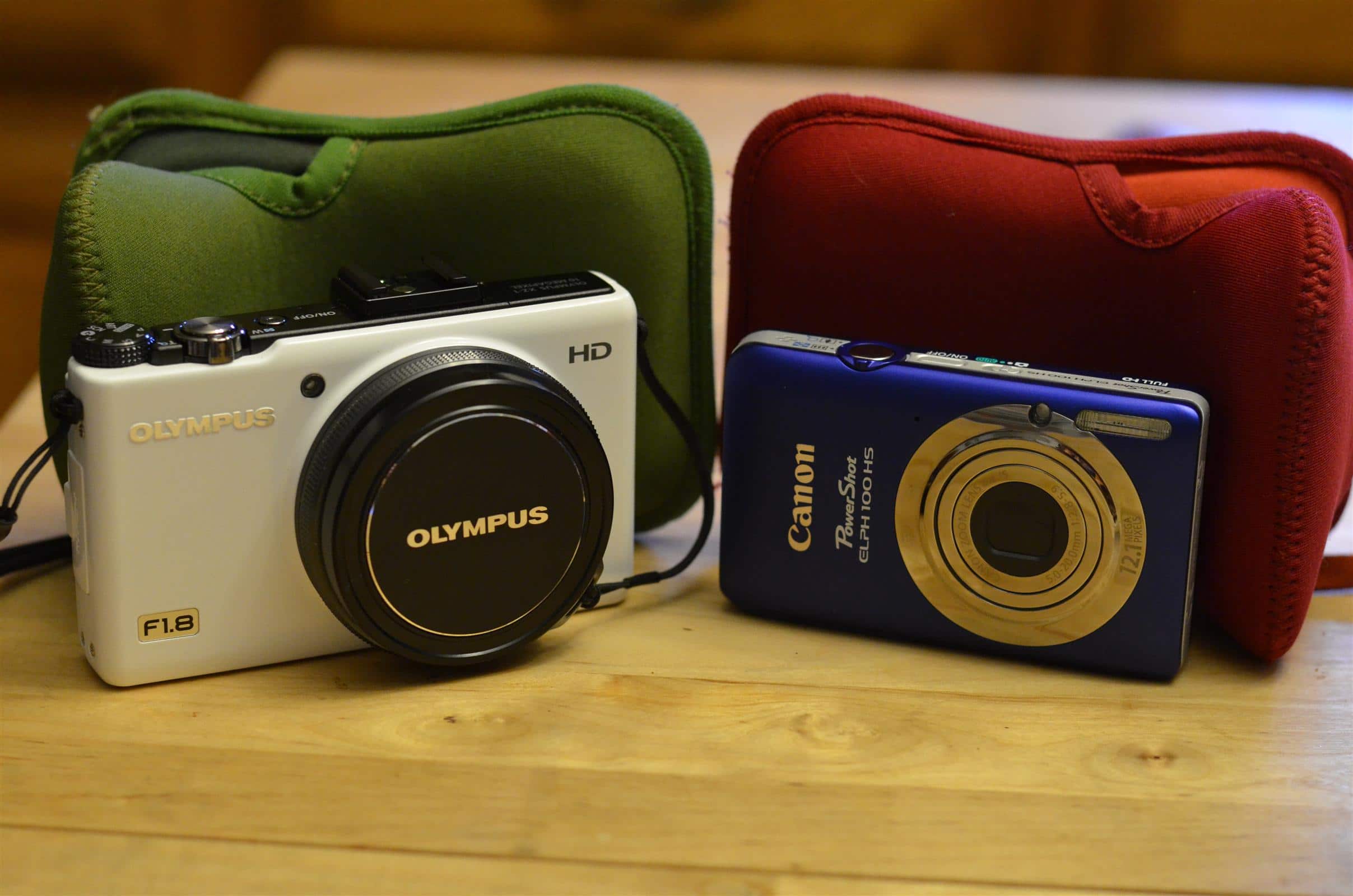 White Olympus XZ-1 and blue Canon ELPH 100 HS