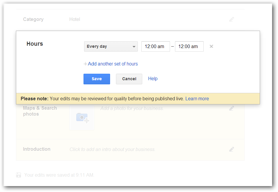 24-hours-google-places-local-plus Wednesday, 2014.03.19 J.D. H. Leave a comment Everyday, 12AM-12AM Return to Set 24/7 operating hours for Google Places business listing
