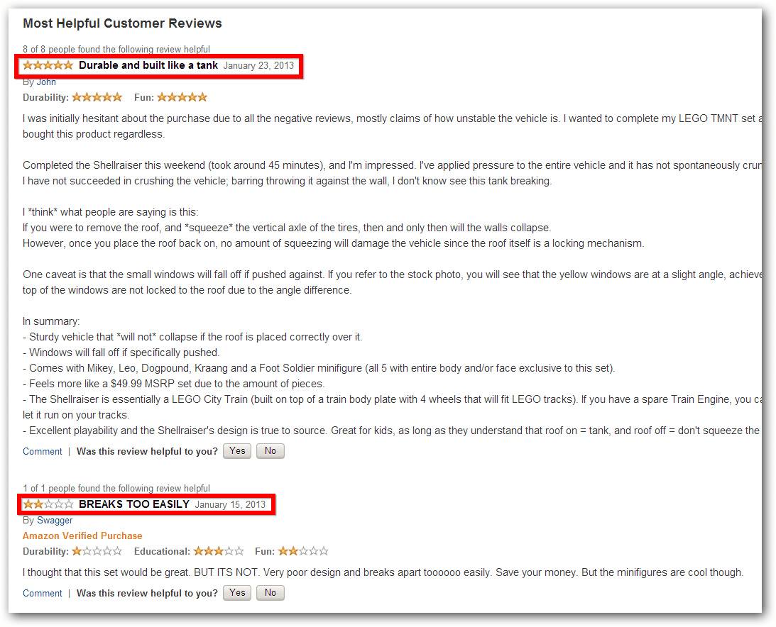amazon-reviews-opposite-opinions Wednesday, 2013.05.29 J.D. H. Leave a comment Durable and Built Like a Tank (5 stars) vs.BREAKS TOO EASILY (2 stars) Who is right? Return to Amazon reviews: room for improvement