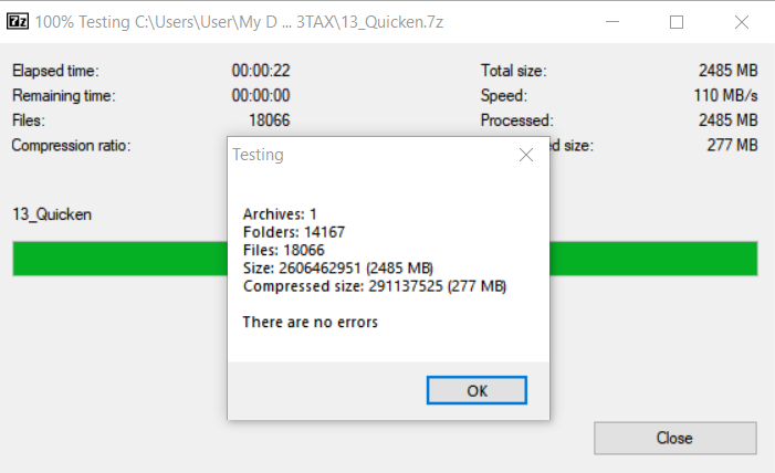 The folders themselves were consuming 16.8 GB of storage — not enormous, but 25,000 directories create real overhead in sync times, backups, and filesystem metadata. I compressed each year’s Quicken folder into a 7z archive (non-solid mode, so any corruption only damages individual files rather than the whole thing), verified with 7-Zip’s built-in integrity check, then deleted the originals.
