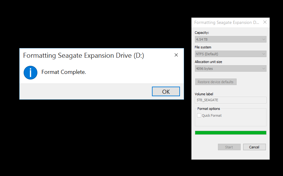5TB Windows 10 format confirmation dialog Friday, 2015.10.09 J.D. H. Leave a comment 5TB fotmatted! Return to How long does it take to format a 5TB drive? [ANSWERED]