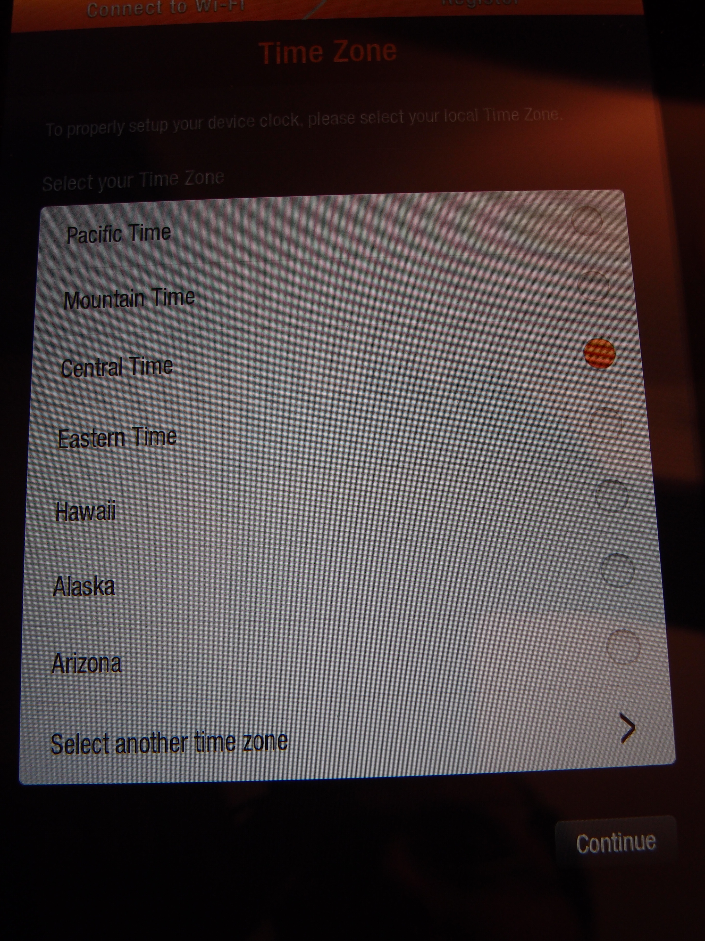 Kindle Fire time zone screen