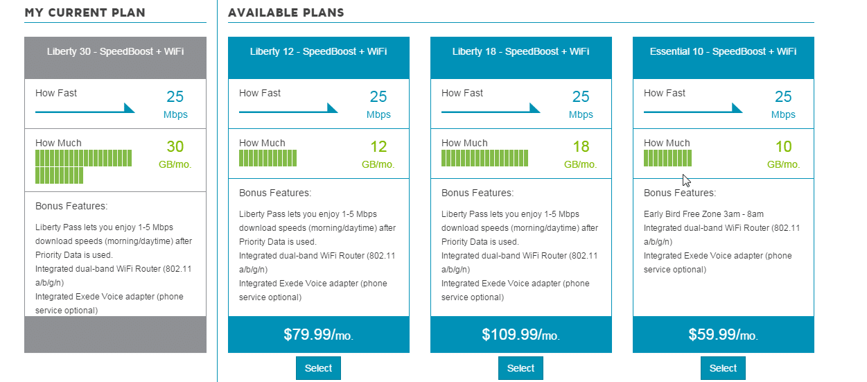 Exede internet plans and prices Saturday, 2016.01.30 J.D. H. Leave a comment Exede’s top speed plans in my area (MO) Return to New Exede Speedboost plans + wifi [review & prices]