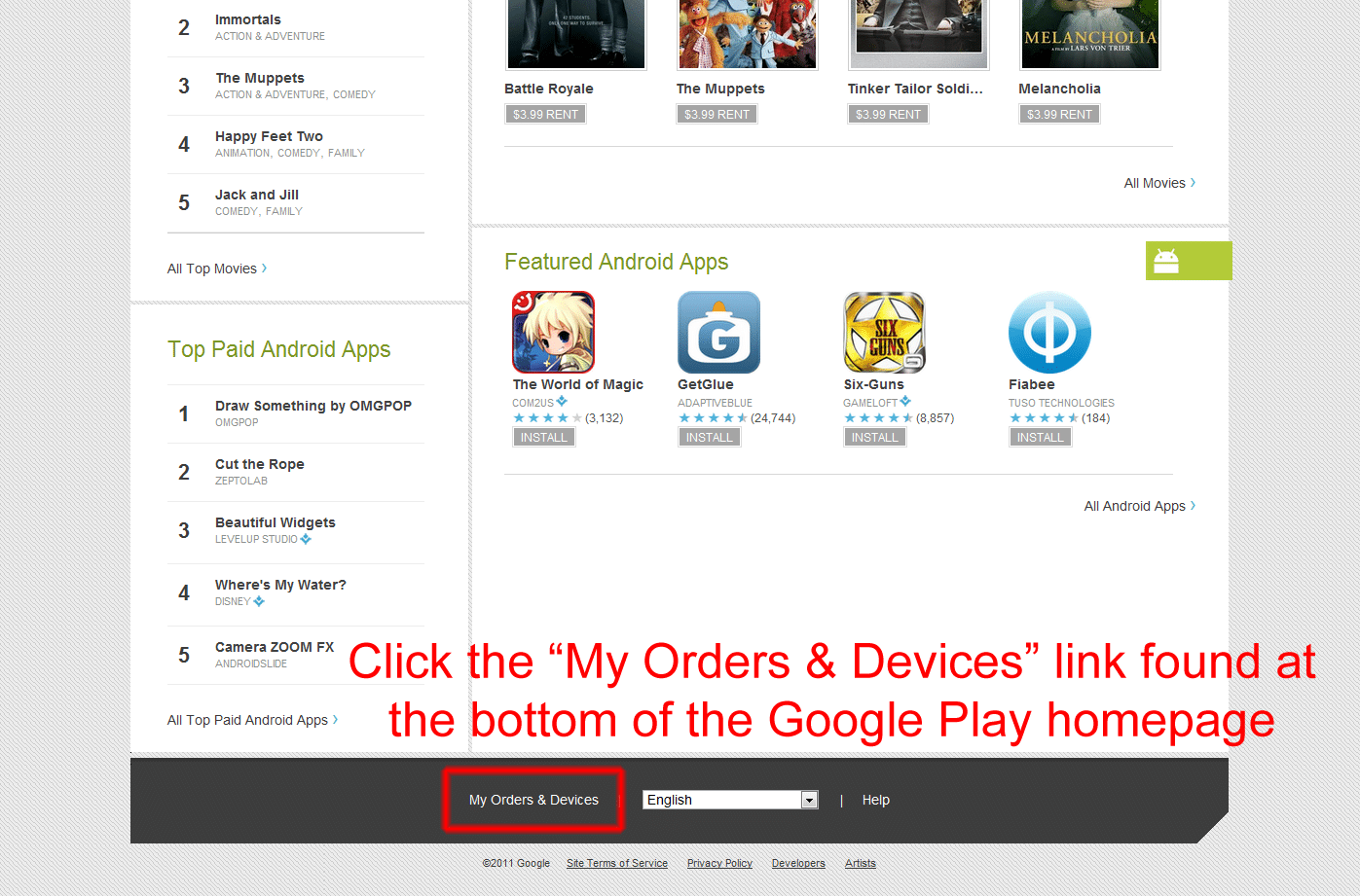 Scroll to the bottom of the Google Play home page and click the “My Orders & Devices” link