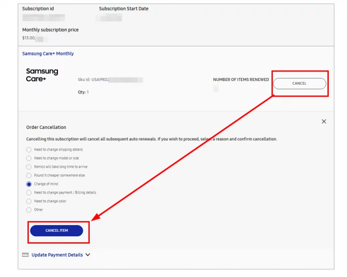 and cancel from there. (view details -> Cancel) ✅ - By phone: Call Samsung Care+ support at 1-866-371-9501.