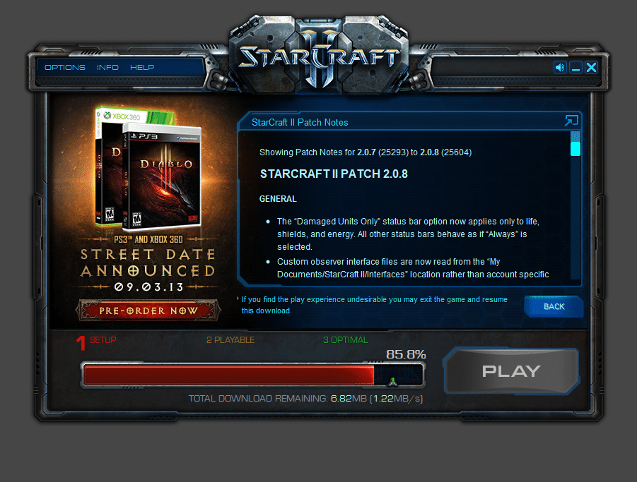 SC2 patch at 85.8% Sunday, 2013.06.16 J.D. H. Leave a comment Update at 85.8% Next Return to Starcraft 2 Patch 2.0.8 & Blizzard Setup -> Playable -> Optimal