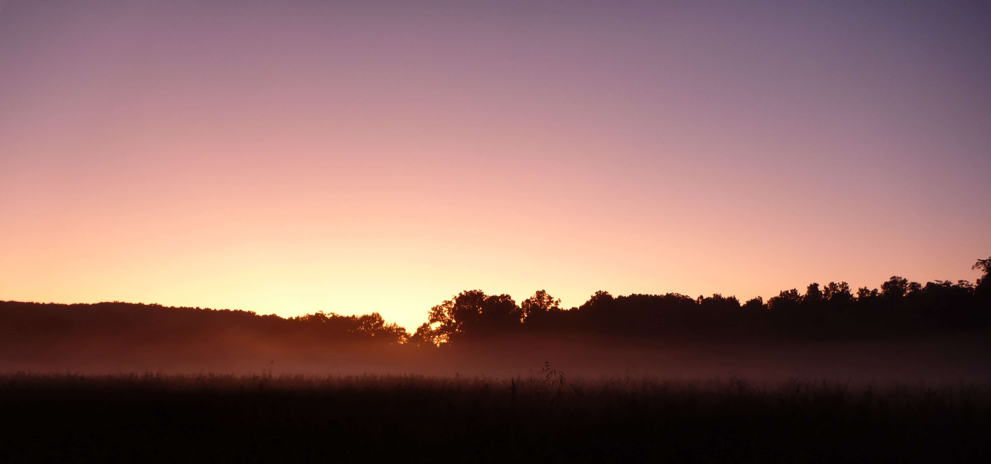 Foggy and colorful sunset at the farm.