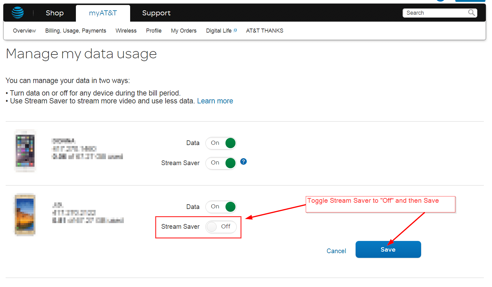 Billing & Usage – AT&T – Manage Data – Stream Saver 2 Thursday, 2017.03.09 J.D. H. Leave a comment Stream Saver OFF Previous Return to Turn “Stream Saver” OFF under manage data [SOLVED for ATT]